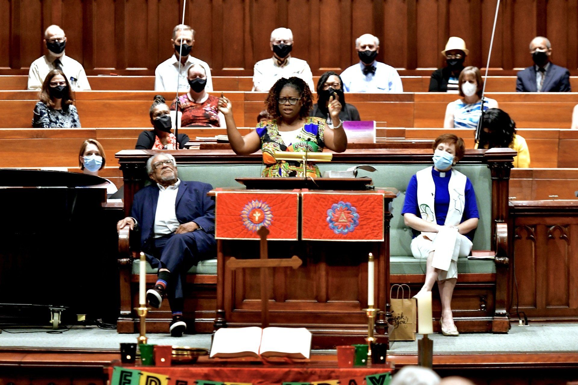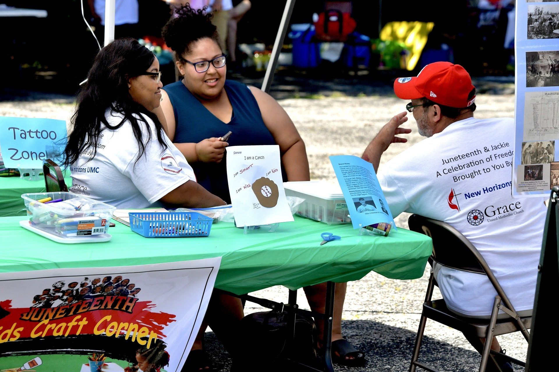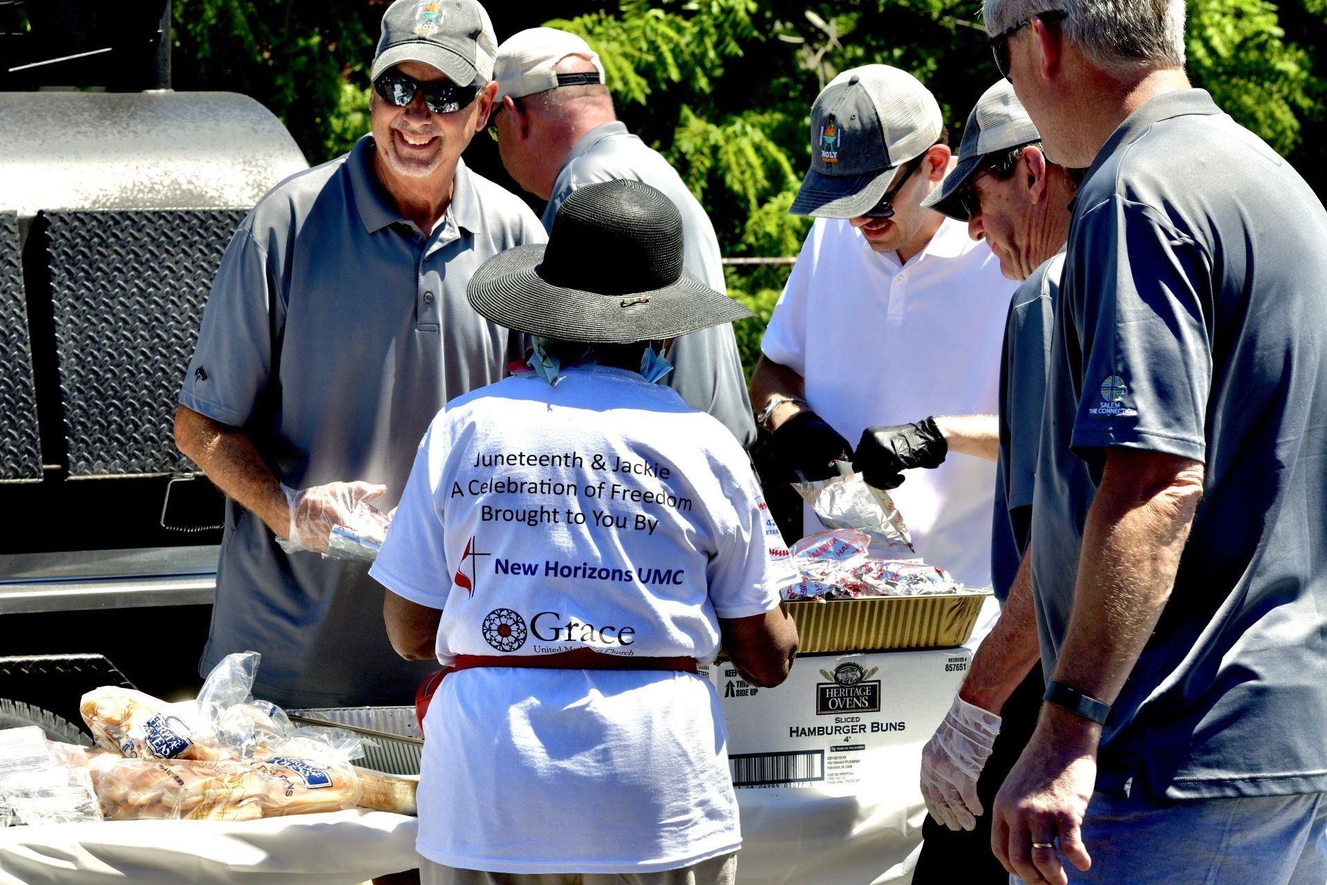 On June 18-19, 2022, Grace UMC partnered with New Horizons UMC for a 2-day community event honoring Juneteenth and the 75th anniversary of Jackie Robinson breaking the color barrier in Major League Baseball. On Saturday, we held a family-friendly block party and BBQ at New Horizons with music from Pastor Nick Savage's jazz quartet and free food courtesy of Salem UMC's Holy Smokers. On Sunday, Grace hosted the second annual combined Juneteenth worship service with New Horizons, featuring music from the combined choirs and guest preacher Rev. Dr. Dietra Wise Baker, Assistant Professor of Contextual Education and Community Engagement and Director of Contextual Education at Eden Seminary.